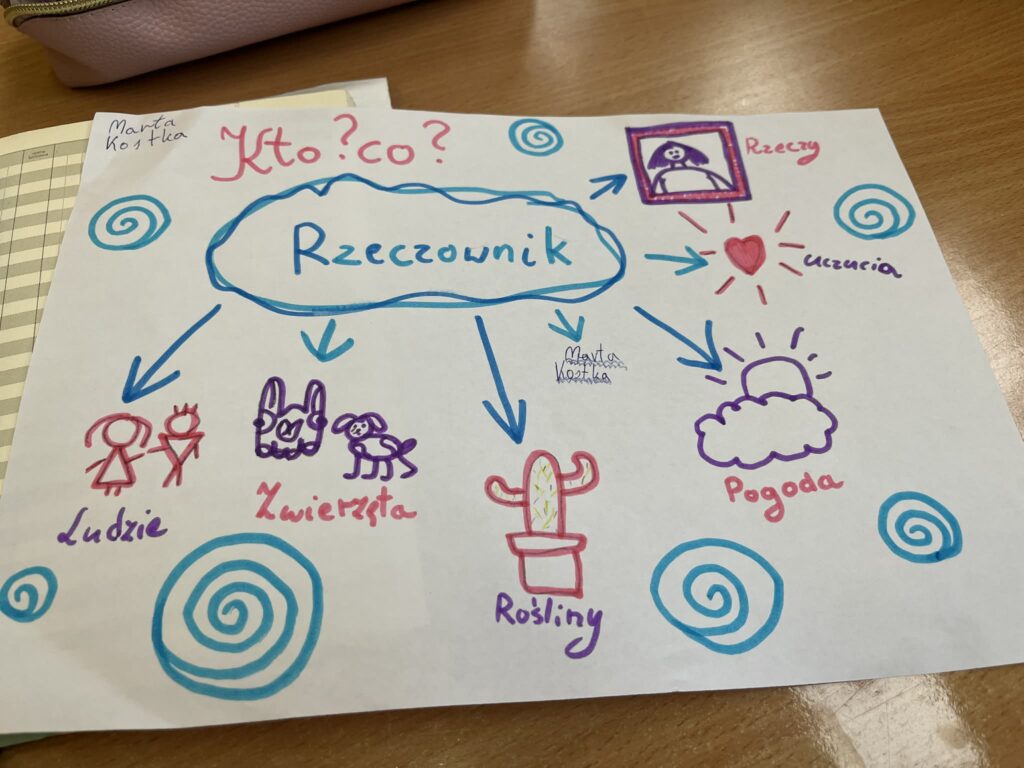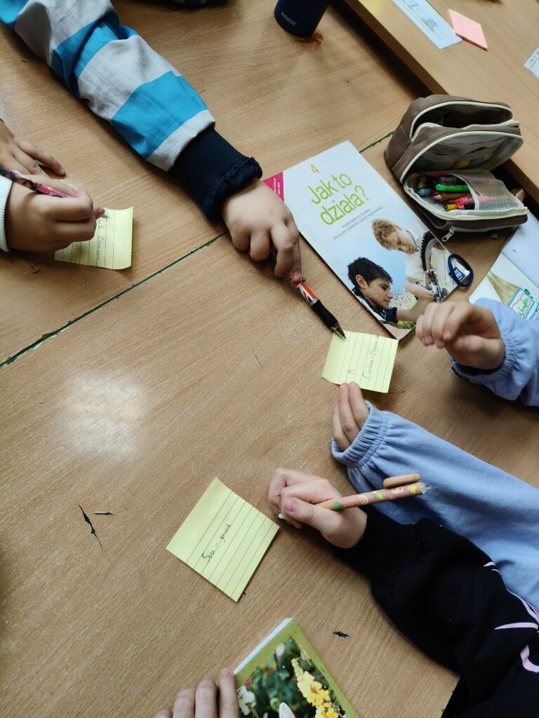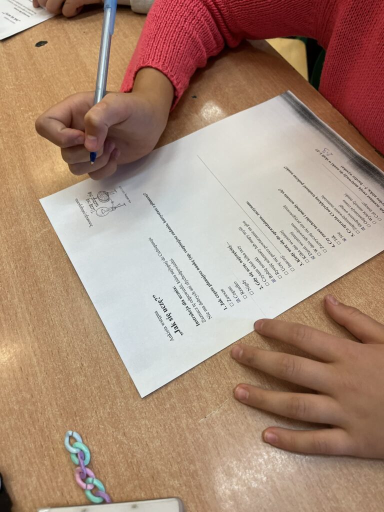 Podczas lekcji ćwiczyliśmy też planowanie nauki — uczniowie uczyli się, jak organizować czas na powtórki materiału i przygotowywać się do kartkówek czy sprawdzianów. Dzieci chętnie dzieliły się własnymi sposobami, które pomagają im zapamiętywać trudne informacje, a także wspierały się nawzajem w zdobywaniu nowych umiejętności.