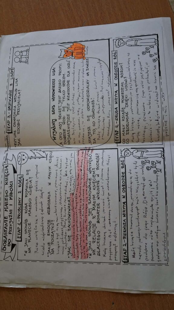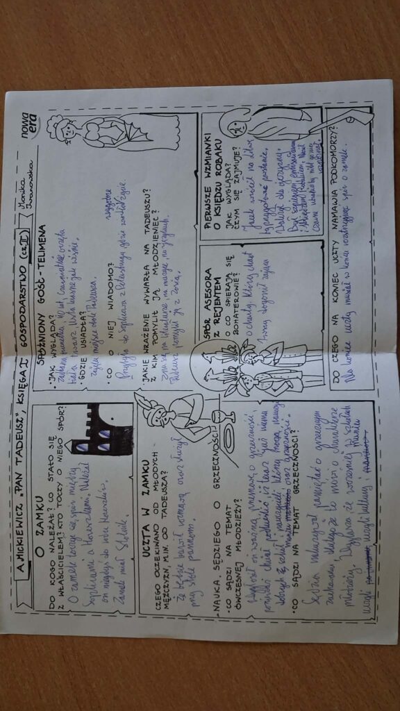 Uczniowie klas ósmych pracowali metodą sketchnotingu – tworzenia notatek wizualnych łączących krótkie zapisy tekstowe z prostymi rysunkami, symbolami i schematami. Najpierw uczniowie poznali podstawowe zasady tej techniki, takie jak stosowanie ikon, strzałek, ramek czy haseł kluczowych. Następnie samodzielnie opracowywali wybrane zagadnienia z lektur i materiałów omawianych na lekcjach języka polskiego.