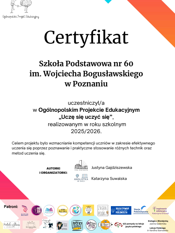 W pierwszym półroczu klasy 4A, 5B oraz uczniowie klas ósmych wzięli udział w Ogólnopolskim Projekcie Edukacyjnym „Uczę się uczyć się”. Celem projektu było poznawanie skutecznych strategii uczenia się oraz rozwijanie umiejętności organizacji własnej pracy i koncentracji.